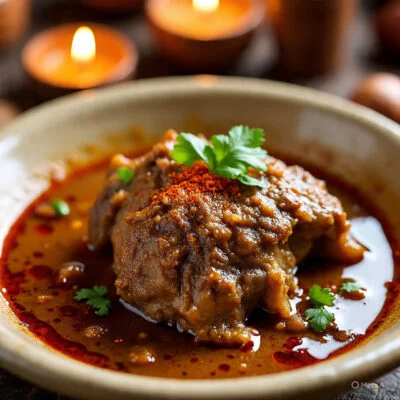 Slow-cooked mutton in a thick, intensely flavored gravy. Rich, spicy, and deeply aromatic with a rustic texture.